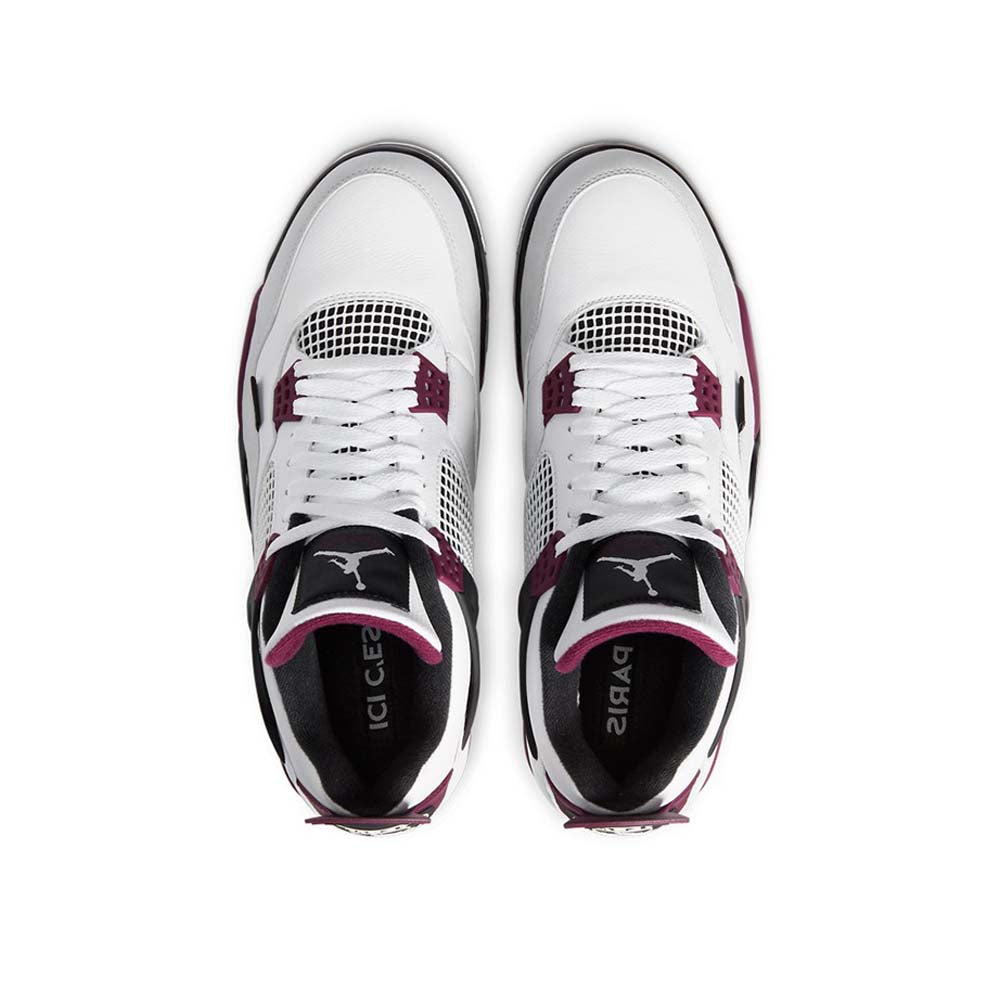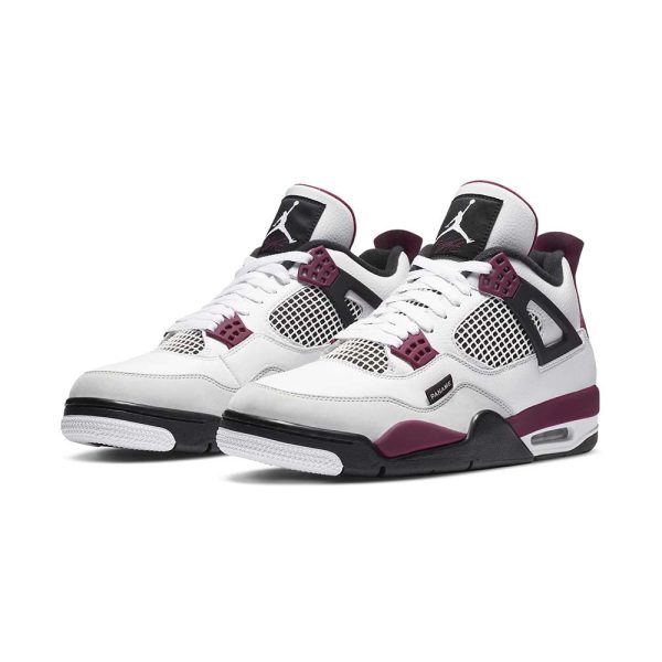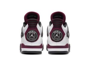 The Air Jordan 4 PSG “Paris Saint Germain” is a desirable collaboration between the European football club and Jordan Brand on Michael Jordan’s fourth signature shoe. Paris Saint Germain, or simply “PSG,” has received special colorways of classic Air Jordans since inking a sponsorship deal with Jordan Brand in 2018. The upper features smooth white leather on the mudguard, which spans from the heel to the toe. Tumbled white leather can be found around the eyelets, collar, and heel. Subtle light grey nubuck detailing is located on the toe. White netting is layered over a black synthetic material on the tongue and mid-panel. Bordeaux accenting comes into play on the plastic lace holders and midsole walls. The burgundy hue can also be found on the underside of the tongue and on the heel. Dual “Paris Saint Germain” and Jumpman detailing dots the heel, while an added “Paname” (another word for Paris) tab is found near the toe.