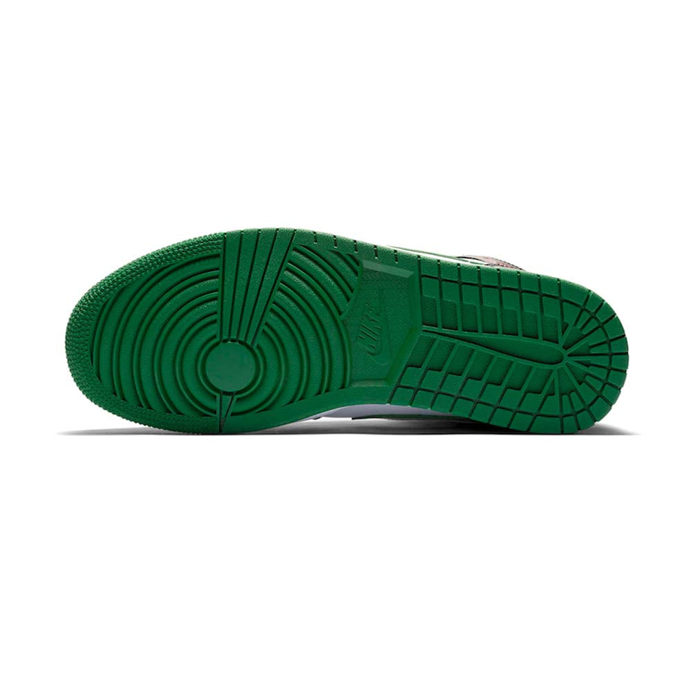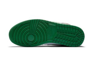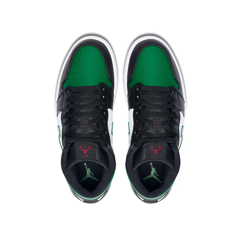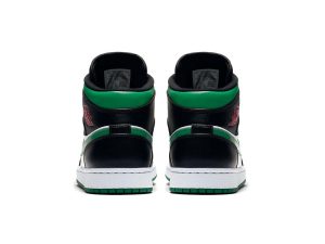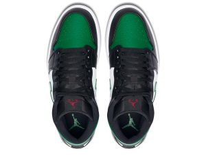 The Air Jordan 1 Mid “Green Toe” is part of Jordan Brand’s continuous efforts of creating ultra-wearable colorways of Michael Jordan’s first signature shoe in mid-top form. Premium leather highlights the upper as black leather overlays on the forefoot and eyelets is contrasted by a white leather base. Jordan Brand references classic Air Jordan 1 styling by equipping the shoe with a perforated green leather toe that contrasts the forefoot. Vibrant red Wings branding on the black collar finishes off the styling.