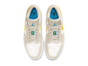 This low-top Air Jordan 1 comes dressed in a Light Orewood Brown, Amarillo, White and Laser Blue color combination. Utilizing White on the base while while palm trees are spread throughout. Light Orewood Brown leather lands on the overlays, liners, laces and neoprene tongues. Other details includes silk Yellow Swoosh logos, Blue accents while White lands on the midsole and Black runs across the rubber outsole.