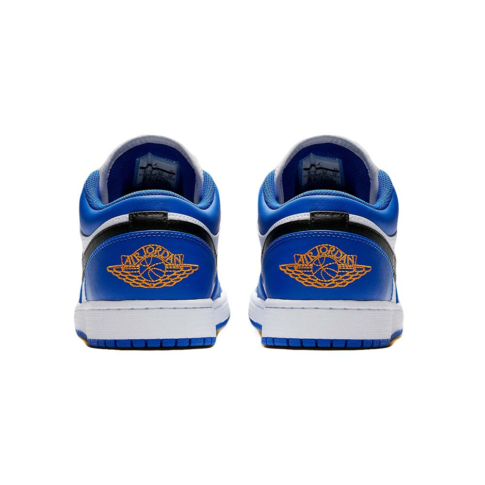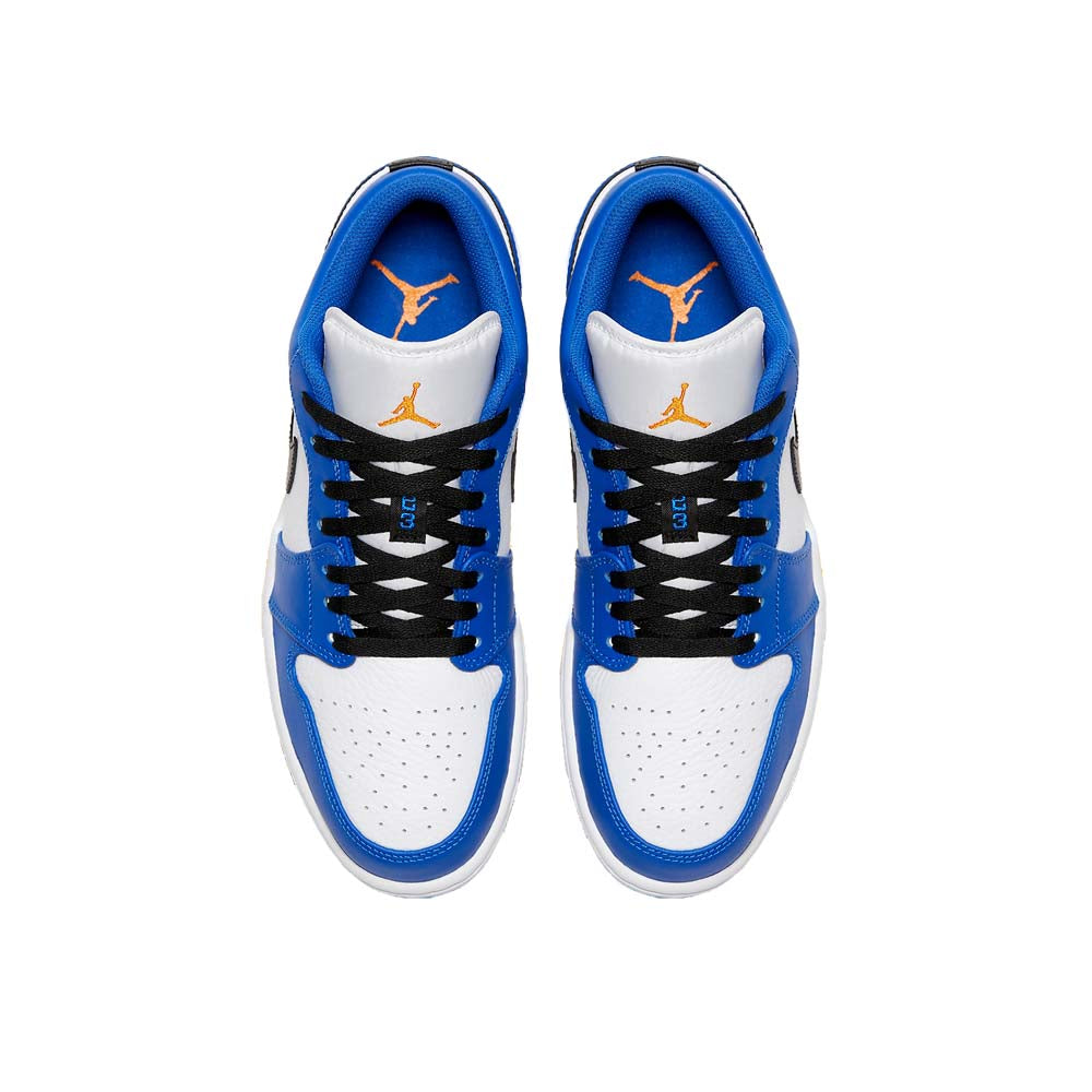 This offering of the low-top Air Jordan 1 features a White leather base with Blue overlays and Black covering the Swooshes and laces. Finishing off the design are Orange accents on the tongues, heels, and insoles atop a White midsole and Blue rubber outsole.