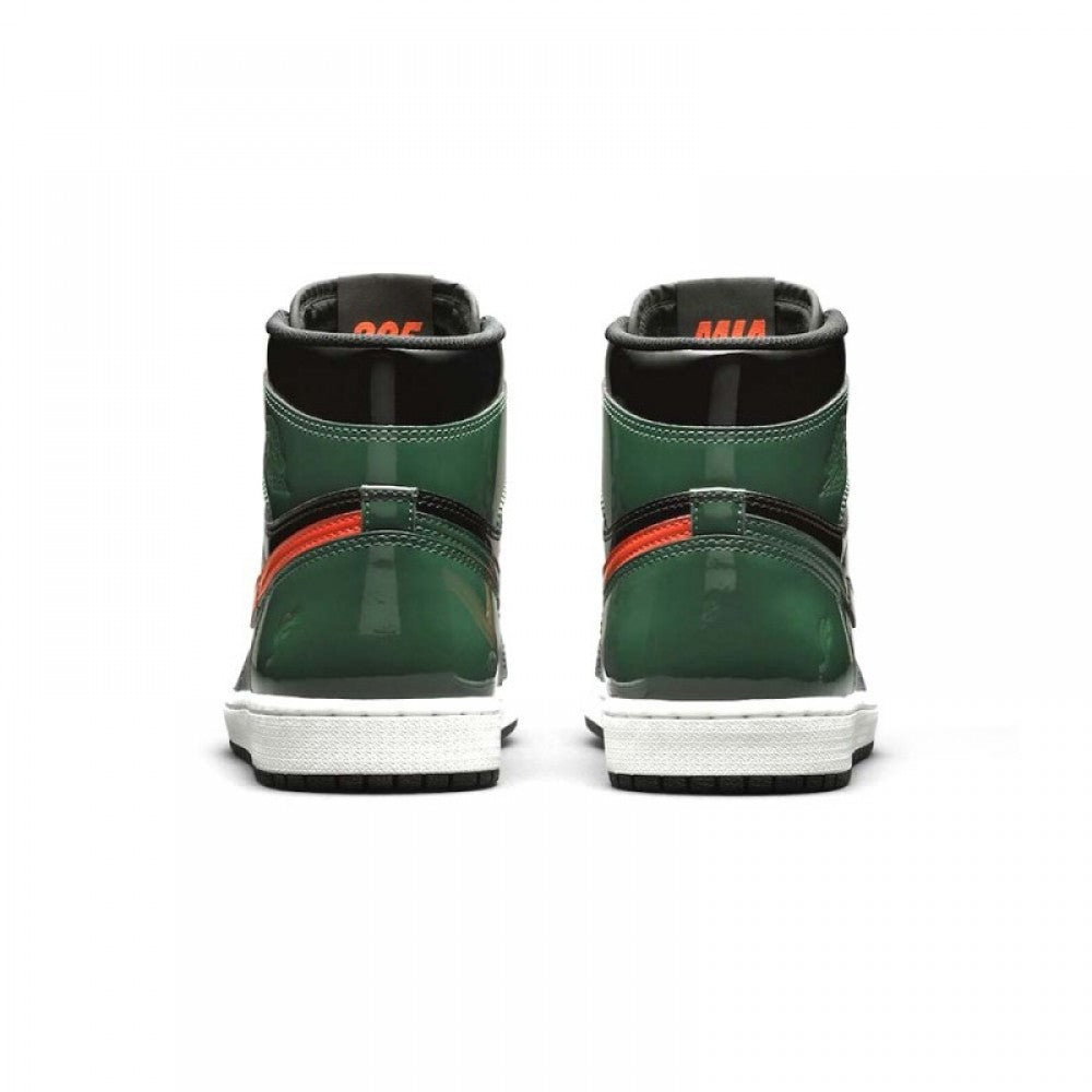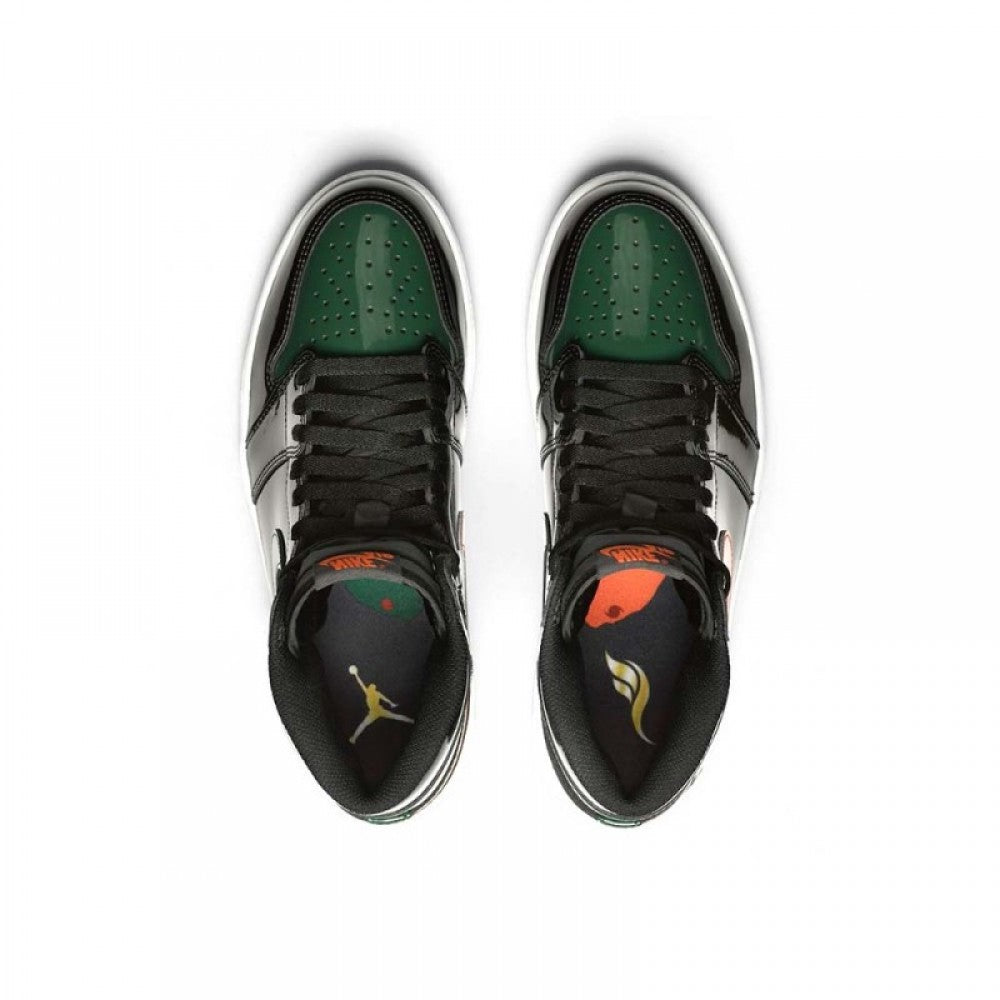 Jordan Brand teamed up with SoleFly to celebrate Art Basel Miami, the international art fair that takes place the first week of December every year. The SoleFly x Air Jordan 1 Retro High OG ‘Art Basel’ Friends & Family features a patent black leather upper with green leather overlays on the toe box, collar, and heel. The high top also boasts embossed Wings details, quilted tongue, and MIA and 305 lettering on the inside of the tongue. The shoe features alternating Swooshes, with a bright orange on the left lateral and right medial shoe, and green on the right lateral and left medial shoe.
