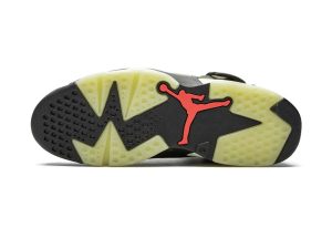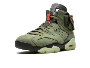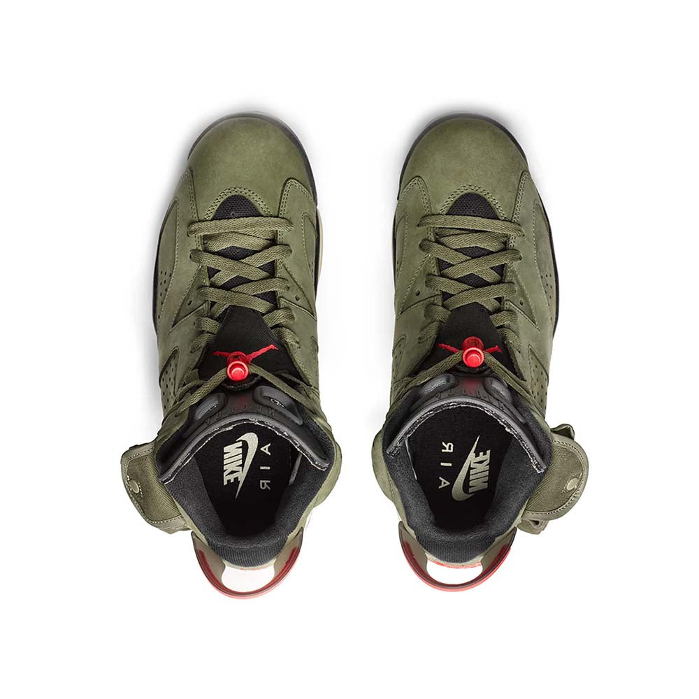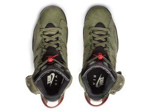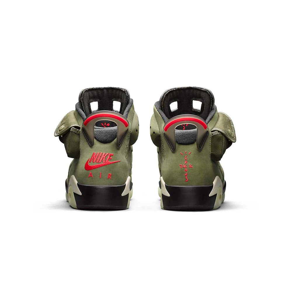The Travis Scott x Air Jordan 6 Retro ‘Olive’ represents a collaboration between the Houston based rapper and Jordan Brand. This take on the AJ 6, which Scott debuted while performing during halftime of Super Bowl 53, released in October 2019. It features a Medium Olive, black, Sail and University Red colorway along with several unique elements: a small pocket with a snap on the collar, a nubuck and suede upper, Scott’s ‘Cactus Jack’ logo on the heel and a glow-in-the-dark translucent outsole.